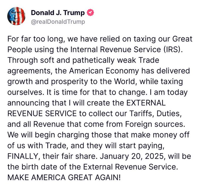 914 views | 3 months agoTrump floats the idea of creating the ERS (External Revenue Service) on his Truth Social Account |
