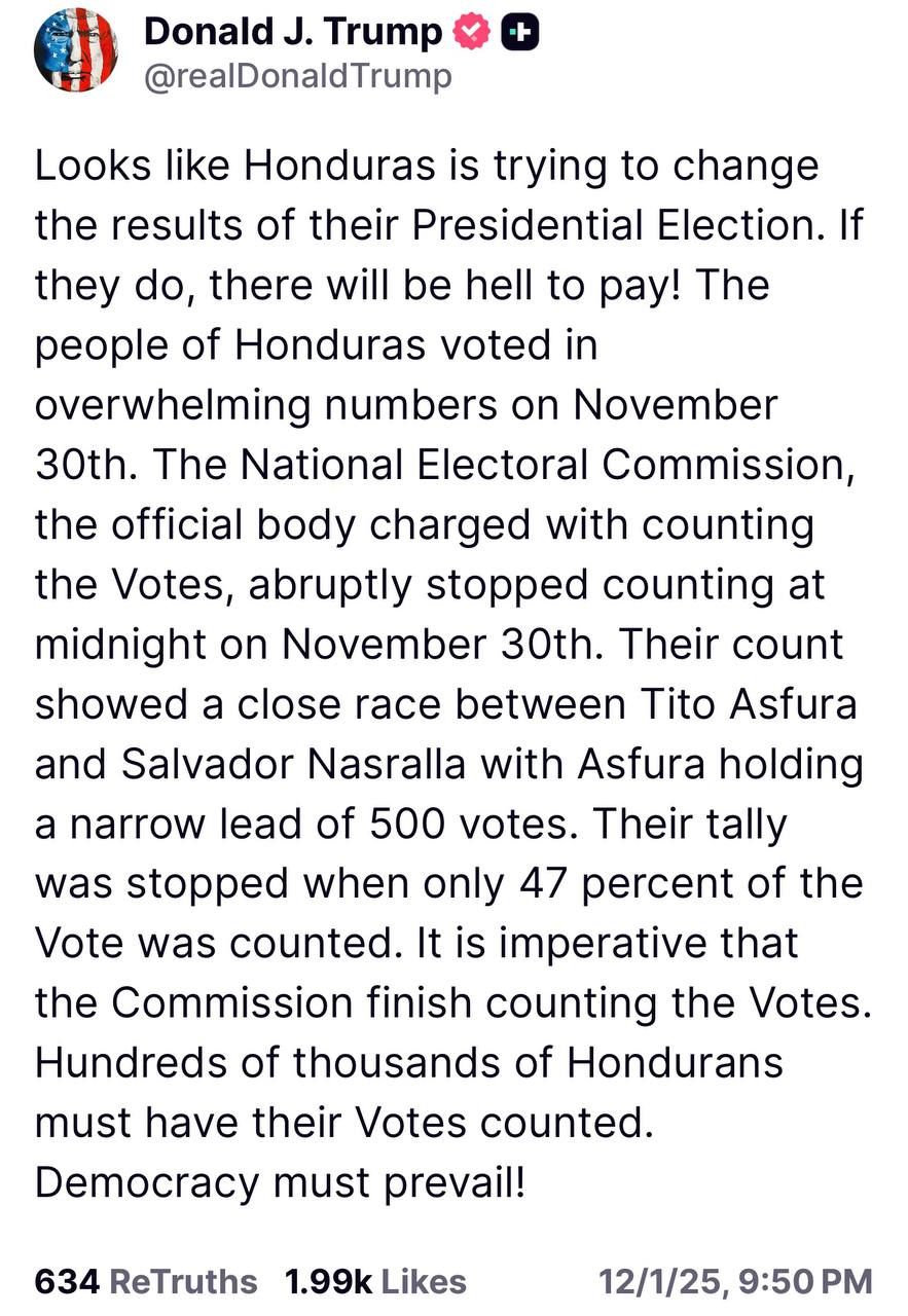 248 views | 9 days agoTrump issues open threat to Honduras over their (s)election |