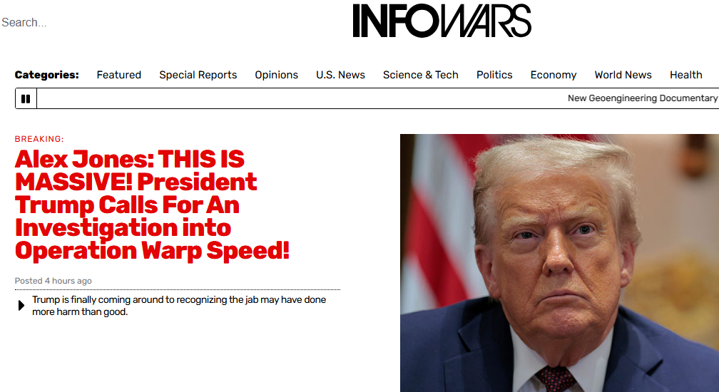 904 views | 3 months agoInfoWars spreads BS about Trump investigating Warp Speed |